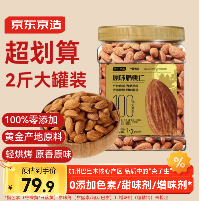 包邮 京东京造原味扁桃仁1kg每日坚果炒货巴旦木仁杏仁量贩0添加零食礼物送礼